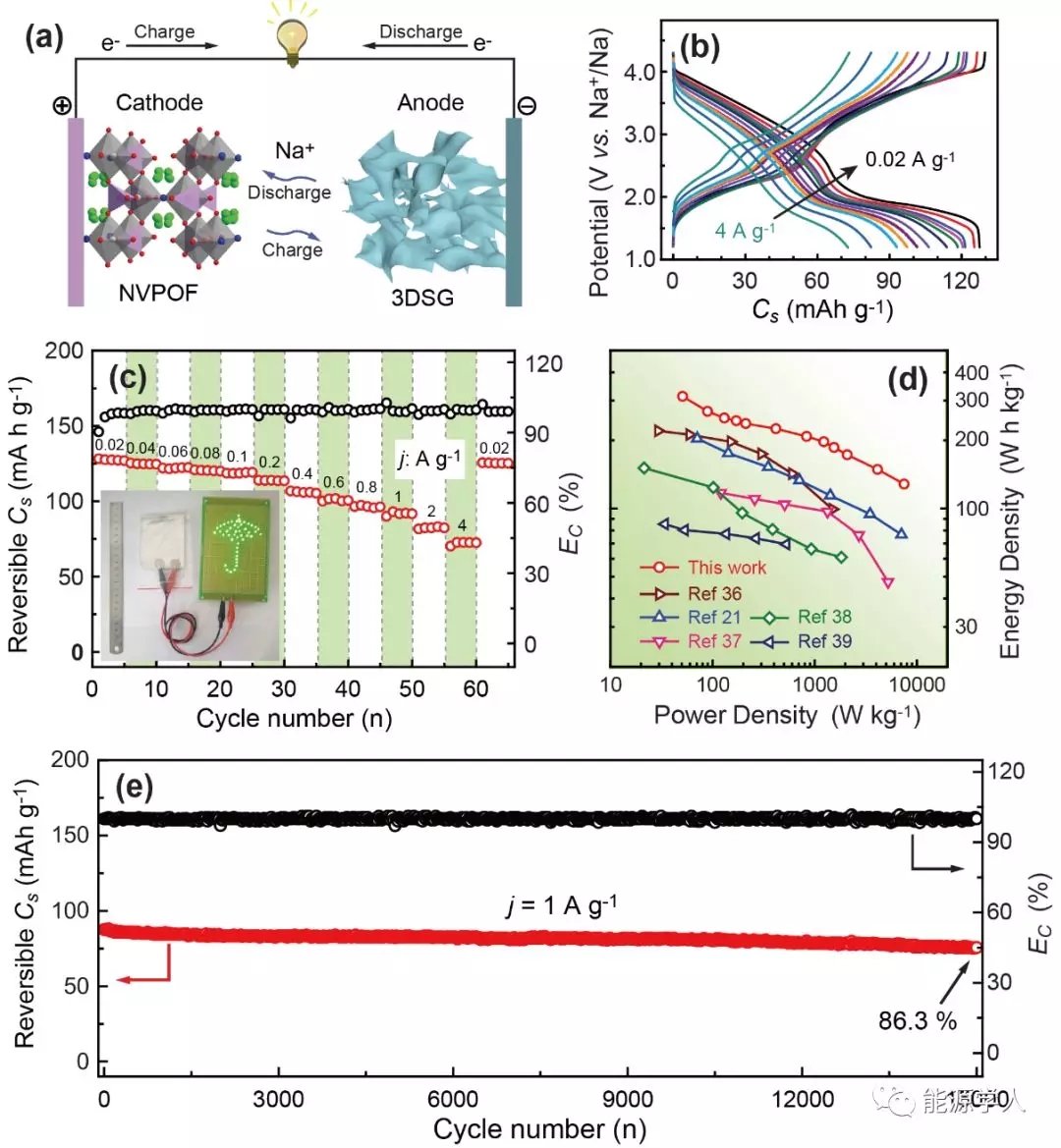 圖2.3DSG//NVPOF鈉離子全電池在室溫條件下的儲(chǔ)能性能:(a)工作原理示意圖;不同電流密度下的(b)充放電曲線和(c)倍率性能;圖c中的插圖:單片軟包電池可點(diǎn)亮47個(gè)綠色LED燈泡組成的顯示屏;(d)功率密度和能量密度之間的相關(guān)性,及其與文獻(xiàn)已報(bào)道工作的對(duì)比結(jié)果;以及(e)循環(huán)性能。