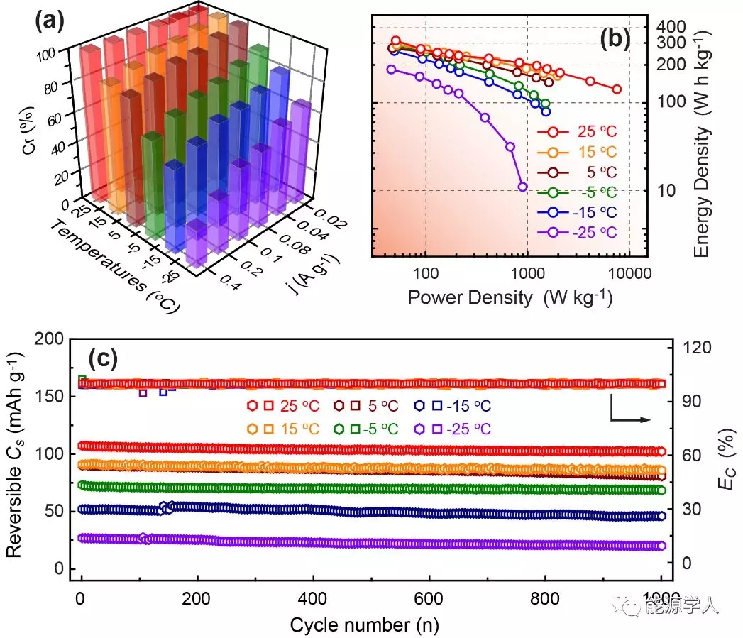圖3.3DSG//NVPOF鈉離子全電池的低溫儲(chǔ)能性能:(a)容量保持率隨電流密度和溫度的變化情況;不同溫度下(b)功率密度和能量密度之間的關(guān)系以及(c)循環(huán)穩(wěn)定性能。