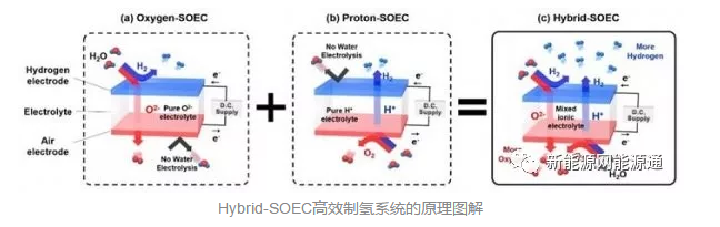 有鑒于此,他們開發(fā)出了全新的Hybrid-SOEC系統(tǒng),即借助一種混合離子導(dǎo)體、來(lái)同時(shí)傳輸負(fù)氧離子和帶電荷的氫離子(質(zhì)子),從而充分利用了固態(tài)電解槽的所有優(yōu)點(diǎn)、提升了制氫的效率。