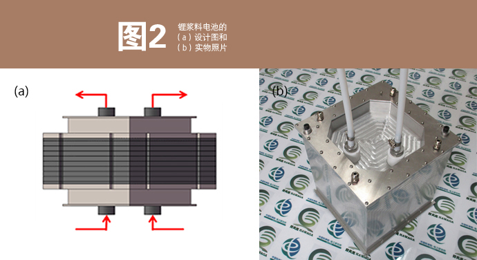 電池反應(yīng)器是鋰漿料電池的核心部件,由分別位于隔離層兩側(cè)的正極反應(yīng)腔和負極反應(yīng)腔構(gòu)成。由于電極漿料具有黏度大、顆粒分散穩(wěn)定性要求高的特點,因此陳永翀教授團隊針對電池反應(yīng)器的腔體結(jié)構(gòu)進行了特殊設(shè)計,以促使電極漿料在腔體內(nèi)的均勻流動或分布,同時實現(xiàn)較好的導(dǎo)電性能。此外,還對集流體、隔離層等進行設(shè)計,減小電池極化內(nèi)阻,提高隔離層強度,以滿足電池組裝和運行的需求,目前團隊已制備出容量大于40Ah的電池模塊。