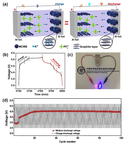 結(jié)合鉀離子電池與雙碳電池各自的優(yōu)點,唐永炳及其團隊成員季必發(fā)、張帆等人成功研發(fā)出一種新型高性能、低成本、環(huán)保友好的雙碳鉀離子電池。該電池采用中間相碳微球為負(fù)極,膨脹石墨作為正極;電解液采用廉價易得的六氟磷酸鉀作為鉀鹽電解質(zhì)溶于有機溶劑中。其反應(yīng)機理為:充電時,電解液中的鉀離子運動到中間相碳微球負(fù)極表面,并嵌入至石墨層中,同時六氟磷酸根陰離子插層到正極石墨中;放電時,鉀離子從負(fù)極石墨層中脫出,同時正極石墨中的六氟磷酸根脫嵌回到電解液中。