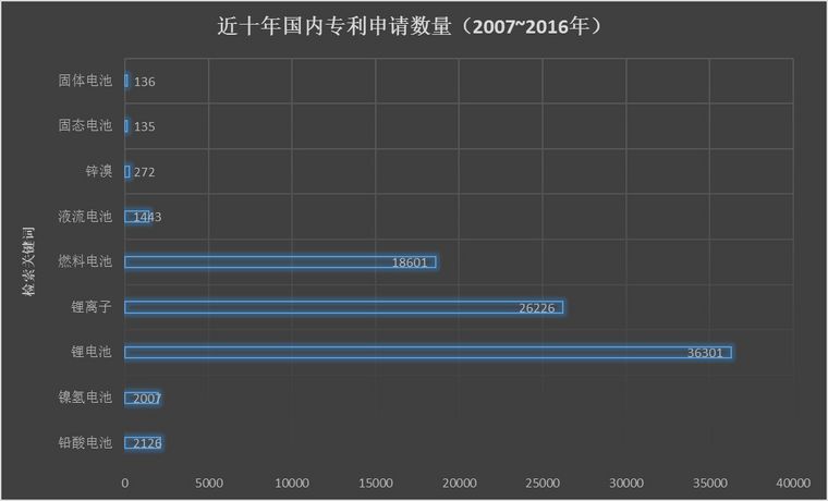鋰電池?zé)o可厚非的是當(dāng)下最時髦的電池技術(shù),在消費(fèi)級市場,動力電池和儲能領(lǐng)域,都被寄予著厚望。所以當(dāng)我以鋰離子或鋰電池為檢索關(guān)鍵詞的時候,檢索出的專利數(shù)量都在2萬件以上。相應(yīng)的,像燃料電池這樣即將呼之欲出的技術(shù),近十年的專利技術(shù),也接近了2萬件。而向鉛酸電池、鎳氫電池這樣的成熟電池技術(shù),專利數(shù)則在2千件左右。固態(tài)電池相關(guān)技術(shù),專利數(shù)只有一兩百件,說明這個技術(shù)普遍在行業(yè)內(nèi)認(rèn)知程度還不高。