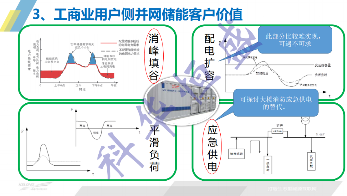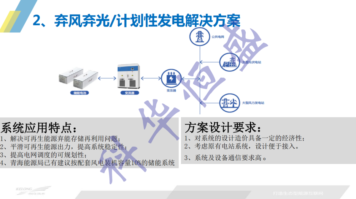 最后介紹一下我們并機(jī)的專利技術(shù),并機(jī)在我們公司是比較早已經(jīng)具備這個(gè)能力,而且是國(guó)內(nèi)首家具備這種能力的公司,在2004年的時(shí)候,我們創(chuàng)始人就已經(jīng)申請(qǐng)這么一個(gè)專利并聯(lián)技術(shù),所以我們?cè)趦?chǔ)能并聯(lián)系統(tǒng)上的一個(gè)優(yōu)勢(shì)還是比較突出的。接下來(lái)簡(jiǎn)單介紹一下應(yīng)用方案和案例,這是調(diào)峰調(diào)頻的解決方案,主要是補(bǔ)償原有的一個(gè)發(fā)電機(jī)組的控制、相應(yīng)速度慢的問(wèn)題,由前面的藍(lán)色通過(guò)加入儲(chǔ)能后變成后面紅色的這么一個(gè)波形。還有計(jì)劃性的解決方案也可以儲(chǔ)能系統(tǒng),平滑或者再利用光伏新能源的能量。這是用戶側(cè)的儲(chǔ)能解決方案,這套系統(tǒng)可以實(shí)現(xiàn)并網(wǎng),也可以實(shí)現(xiàn)離網(wǎng),也可以實(shí)現(xiàn)并離網(wǎng)切換。