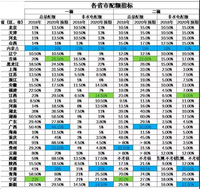 與首輪征求意見稿相比,大部分省區(qū)配額指標存在不同程度的變動。例如京津冀三地2018年可再生能源電力總量配額指標均由11%下調(diào)為10.5%,其2020年的預期指標則從13.5%上調(diào)為15%;四川、云南兩地的2018年及2020年的可再生能源總量配額指標也從具體數(shù)值指標變?yōu)閰^(qū)間指標(≥80%即可);西藏自治區(qū)總量配額和非水配額則由第一版明確的數(shù)值指標調(diào)整為不考核。