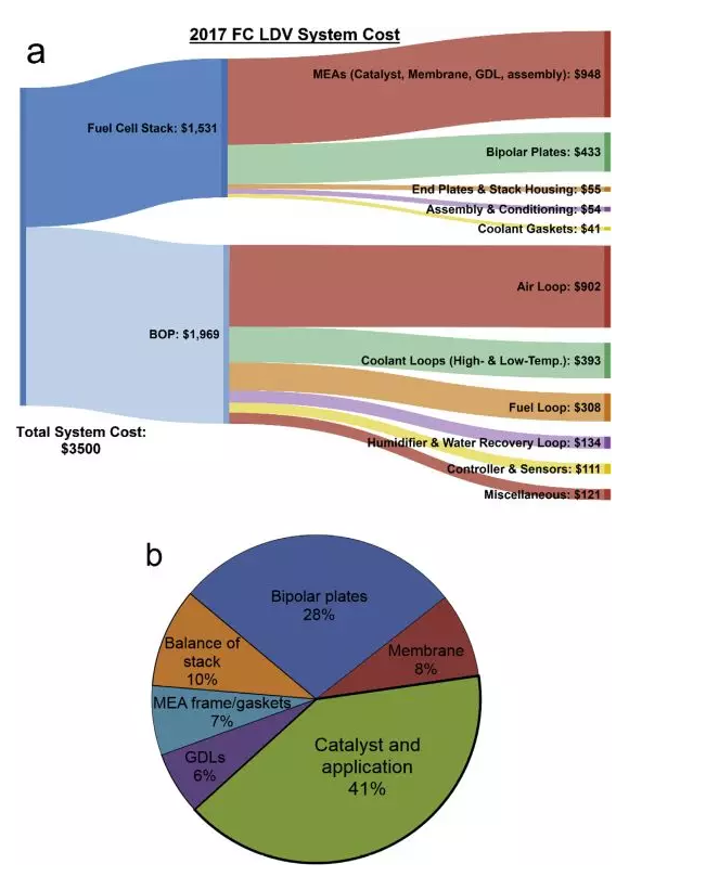 500,000 個(gè)/年:a)2017年燃料電池系統(tǒng),b)燃料電池堆棧。湯普森等人。