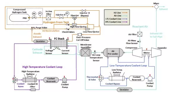 2017 LDV汽車燃料電池系統(tǒng):燃料電池堆和組件,包括空氣回路、燃料回路、高(HTL)和低溫液體(LTL)冷卻劑回路。儲(chǔ)氫罐和閥門(虛線封閉)不包括在成本分析中。湯普森等人。