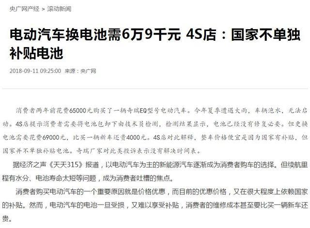 近日,央廣網(wǎng)天天315節(jié)目報道了消費者買電動車遇到的尷尬情況。買了一輛奇瑞EQ電動汽車補貼后新車價格為65000元,車輛泡水后電池報廢了,更換電池竟然需要花費69000元,比買一輛新車還貴4000元。4S店給出的解釋是:國家不單獨補貼電池。