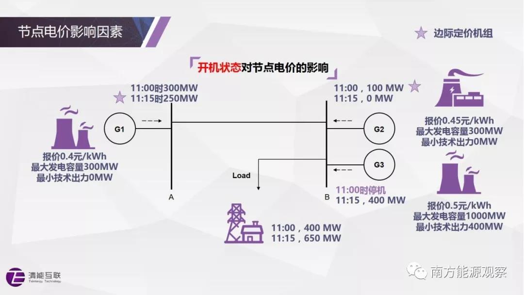 11:15時,系統(tǒng)負(fù)荷為650MW,G1、G2的發(fā)電容量不足以滿足負(fù)荷需求,因此G3開機。由于G3的最小技術(shù)出力為400MW,此時G2降低到最低出力0MW,G1發(fā)250MW,邊際機組為G1,節(jié)點電價為0.4元/kWh??梢姡瑥?1:00-11:15,雖然系統(tǒng)負(fù)荷上升,但受新開機組G3最小技術(shù)出力的影響,節(jié)點電價不升反降。