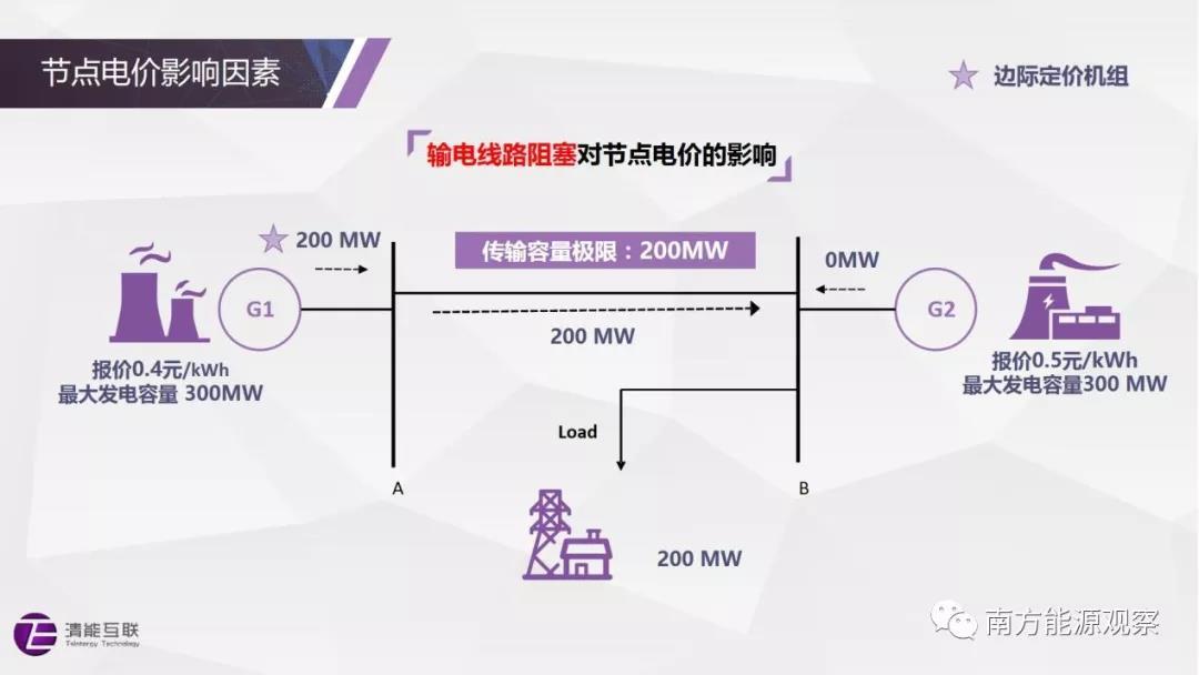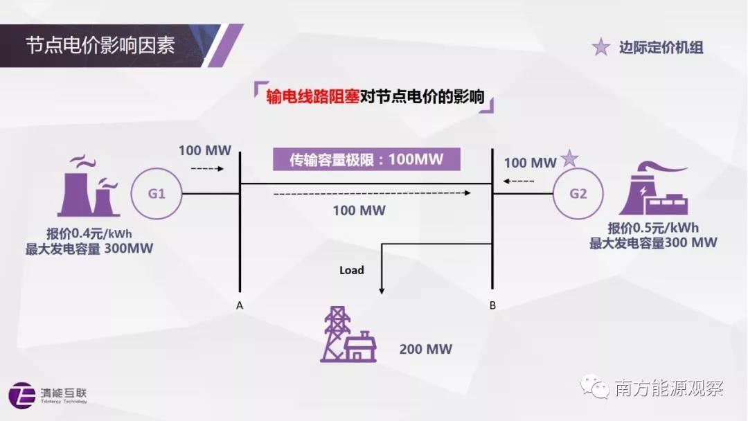 在節(jié)點電價的理解上,一個常見的疑問是節(jié)點電價是否都能夠找到相應(yīng)的機組報價。在沒有網(wǎng)絡(luò)阻塞、不考慮網(wǎng)損價格分量的情況下,這個結(jié)論是成立的,任何節(jié)點的電價都等于全系統(tǒng)邊際機組的報價。然而,當(dāng)存在網(wǎng)絡(luò)阻塞時,節(jié)點電價與機組報價在數(shù)值上未必是對應(yīng)關(guān)系。
