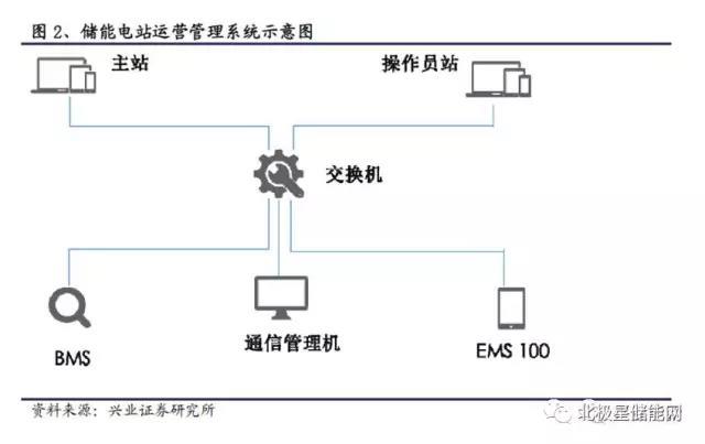 儲能系統(tǒng)中,除了電池的應(yīng)用以外,還涉及到了電池管理系統(tǒng)(BMS)以及過程控制系統(tǒng)(PCS)等。BMS主要用于估測動力電池組的荷電狀態(tài),即電池剩余電量;在電池充放電過程中進行動態(tài)監(jiān)測等,是電池能量管理系統(tǒng)中的一項關(guān)鍵技術(shù)。圖2展示了儲能電站運營管理系統(tǒng)的示意圖。