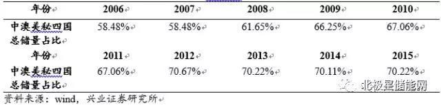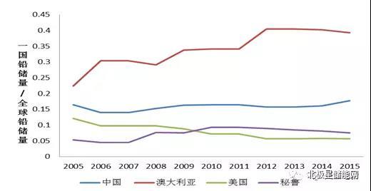 表1、中國、澳大利亞、美國和秘魯四國鉛總儲量占全球鉛儲量比例情況表