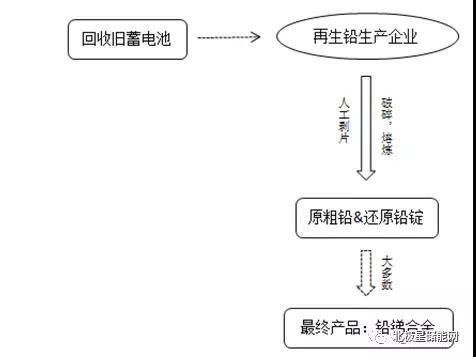 再生鉛的生產(chǎn)流程大致如下:回收使用過的蓄電池,進入再生鉛生產(chǎn)企業(yè)。經(jīng)過人工剝片、破碎以及熔煉等步驟,得到還原粗鉛和還原鉛錠,最后大多加工成鉛銻合金。