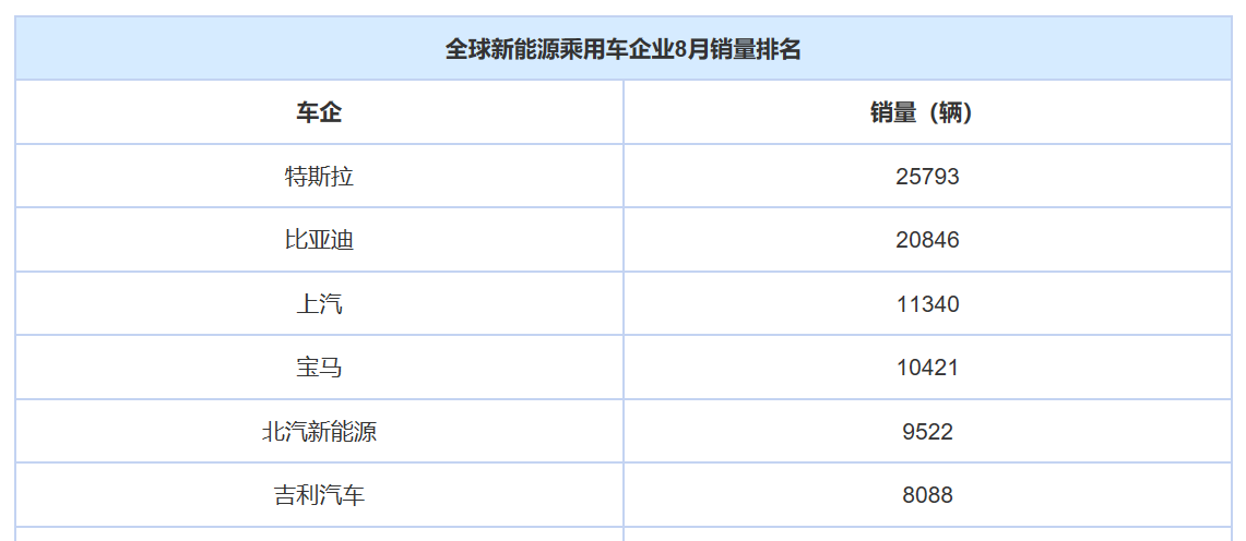 車企方面,8月,特斯拉以銷售25793輛,獲得第一名,比亞迪和上汽則以20846輛、11340輛分列第二和第三。