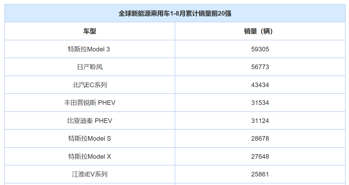 數(shù)據(jù)顯示,1-8月累計銷量排名上,特斯拉Model 3、日產聆風、北汽EC系列分列前三。此外,包含北汽EC系列在內,中國共有5款車型進入了前10強。