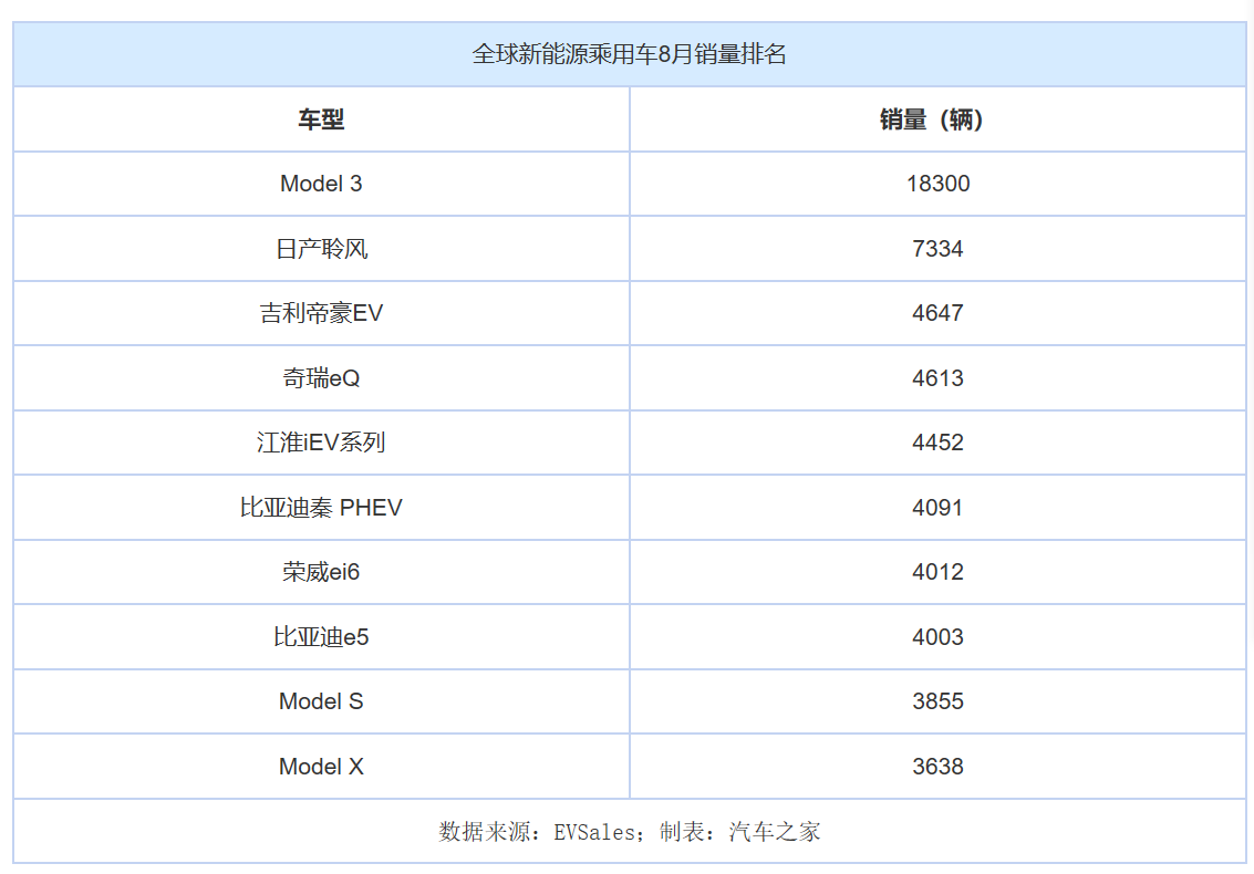 從單個車型來看,8月最暢銷車型為特斯拉Model 3(參數(shù)|詢價),銷量達到了18300輛,創(chuàng)下其新的歷史紀錄;日產聆風保持了和以往相差不多的銷量,以7334輛排在第二位;吉利帝豪EV售出4647輛位列第三。值得一提的是,中國有6款車型進入了8月銷量榜單前十強。