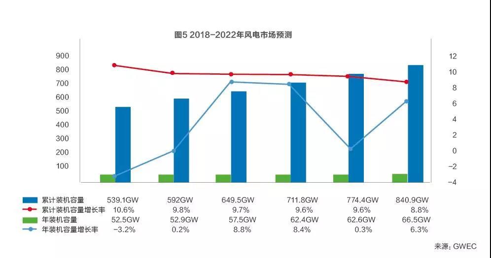 而根據(jù)GWEC《2017年全球風(fēng)電發(fā)展報告》對2018-2022年全球風(fēng)電市場的預(yù)測,2018年全球風(fēng)電市場將基本保持在2017年的水平,2019年和2020年全球風(fēng)電市場恢復(fù)增長,21世紀(jì)20年代初將再次突破60吉瓦;到2022年底,累計風(fēng)電裝機容量總量將達到840吉瓦。(見圖5)
