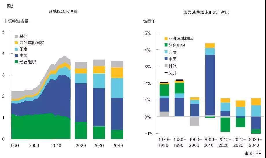 BP認(rèn)為,煤炭消費在展望期間大體平緩,2040年煤炭在一次能源中的比例下降至21%,達到自工業(yè)革命以來的最低值。盡管中國煤炭消費見頂,中國依然是世界上最大的煤炭市場,到2040年占全球煤炭需求的40%。中國和經(jīng)合組織消費量減少的部分,將被印度及其他新興亞洲經(jīng)濟體的需求增加所抵消。印度是煤炭最大的增長市場,在全球煤炭需求中的占比將從2016年的略高于10%翻倍至2040年的25%左右。(見圖3)