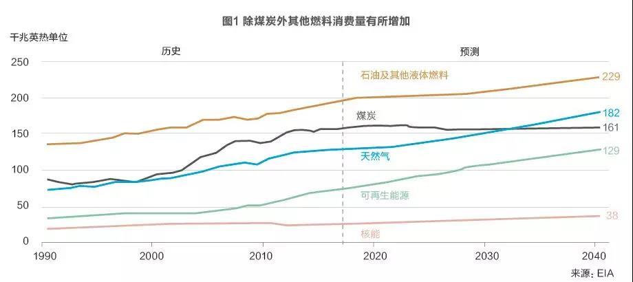 各機構(gòu)預(yù)測,向更低碳的能源結(jié)構(gòu)轉(zhuǎn)型將會持續(xù)。EIA認(rèn)為,到2040年,世界范圍內(nèi),除煤炭外其他燃料消費量均呈增加態(tài)勢(見圖1)。