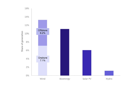 截至二季度末,英國的可再生能源容量為42.2吉瓦,較上年同期增長10%,其中海上風電容量有所增加。陸上風能和太陽能光伏均占可再生能源總量的31%左右,海上風電占19%。