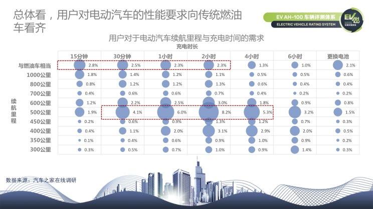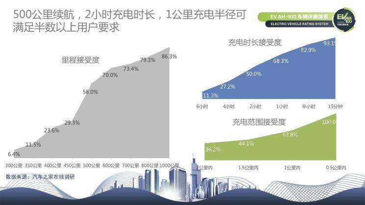 汽車(chē)之家在線(xiàn)調(diào)研結(jié)果顯示,500公里、2小時(shí)充電時(shí)長(zhǎng)、1公里充電半徑能夠滿(mǎn)足半數(shù)以上用戶(hù)需求。更細(xì)化來(lái)看,用戶(hù)對(duì)續(xù)航里程達(dá)到500公里的車(chē)型接受度相比450公里多了將近30個(gè)百分點(diǎn);超過(guò)半數(shù)的用戶(hù)可以接受2個(gè)小時(shí)充電時(shí)長(zhǎng),充電范圍則需要控制在1公里內(nèi),能夠滿(mǎn)足63.8%用戶(hù)需求。