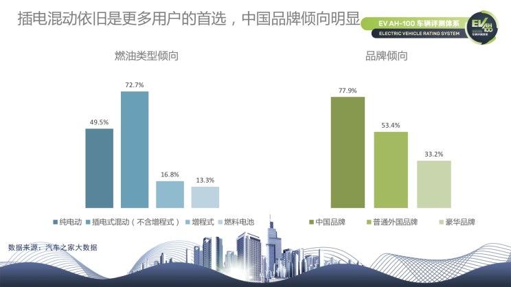 從燃油類(lèi)型傾向上,插電式混合動(dòng)力車(chē)型成為更多用戶(hù)的首選,純電動(dòng)車(chē)型傾向接近半數(shù),其余的增程式和燃料電池車(chē)型,用戶(hù)傾向性一般。在品牌傾向上,更多的用戶(hù)愿意選擇中國(guó)品牌,其次是普通外國(guó)品牌,豪華品牌意愿最低。