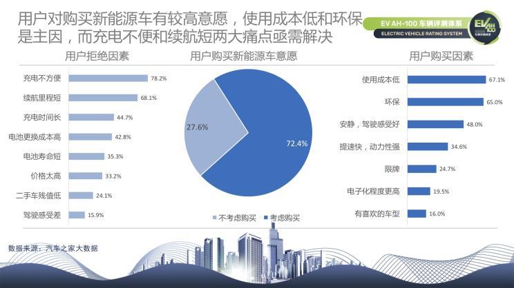 在用戶(hù)的購(gòu)買(mǎi)因素和拒絕因素方面,使用成本低和環(huán)保是用戶(hù)愿意購(gòu)買(mǎi)新能源車(chē)的主要因素,而用戶(hù)拒絕因素,如充電不方便、續(xù)航里程短、充電時(shí)間長(zhǎng)等則是廠(chǎng)家亟需解決的痛點(diǎn)。