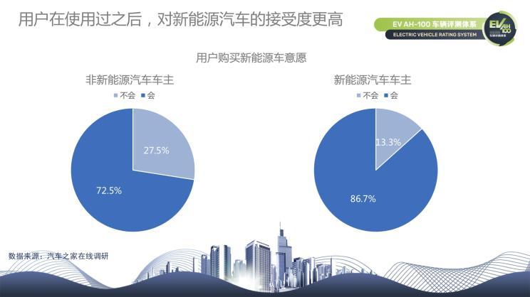 按照非新能源汽車(chē)車(chē)主和新能源汽車(chē)車(chē)主來(lái)劃分,其中約有72.5%的傳統(tǒng)燃油車(chē)主未來(lái)有購(gòu)買(mǎi)新能源汽車(chē)的意愿;而已經(jīng)擁有新能源汽車(chē)的車(chē)主,在有了一定的用車(chē)體驗(yàn)過(guò)后,對(duì)新能源汽車(chē)的接受度要比非新能源汽車(chē)車(chē)主更高,比例達(dá)到86.7%。