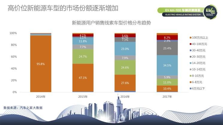 細(xì)分市場(chǎng)格局逐步形成,對(duì)應(yīng)的用戶(hù)關(guān)注價(jià)位也在隨之發(fā)生變化。從汽車(chē)之家大數(shù)據(jù)來(lái)看,新能源用戶(hù)銷(xiāo)售線(xiàn)索車(chē)型價(jià)格分布趨勢(shì)自2014年到2017年,呈現(xiàn)出高價(jià)位新能源車(chē)型市場(chǎng)份額逐漸增加的現(xiàn)象,并強(qiáng)勢(shì)的將原有的低價(jià)位市場(chǎng)份額逐年稀釋。