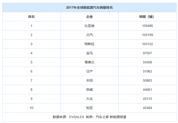 2、中國新能源汽車市場初顯規(guī)?;?yīng)。2017年,全球共有三家企業(yè)新能源汽車銷量超過10萬輛,中國占兩家,分別是比亞迪和北汽新能源。