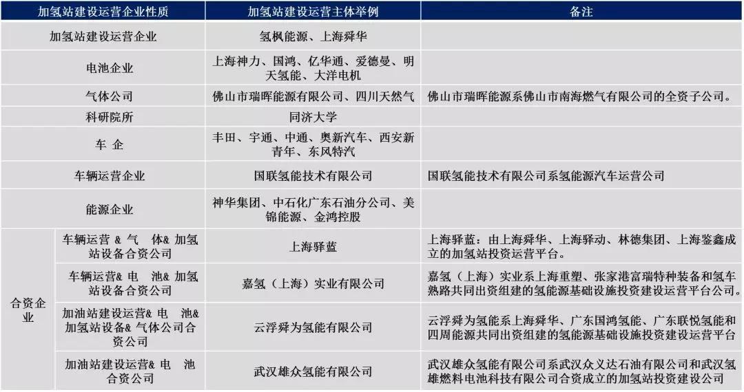 ?車(chē)企:主要有豐田、宇通、中通、奧新汽車(chē)、西安新青年、東風(fēng)特汽、佛汽運(yùn)輸?shù)?,這些企業(yè)中有建加氫站為自身產(chǎn)品的試驗(yàn)運(yùn)行、有的為推動(dòng)地方氫能產(chǎn)業(yè)發(fā)展。下文中企業(yè)性質(zhì)定義為車(chē)企。