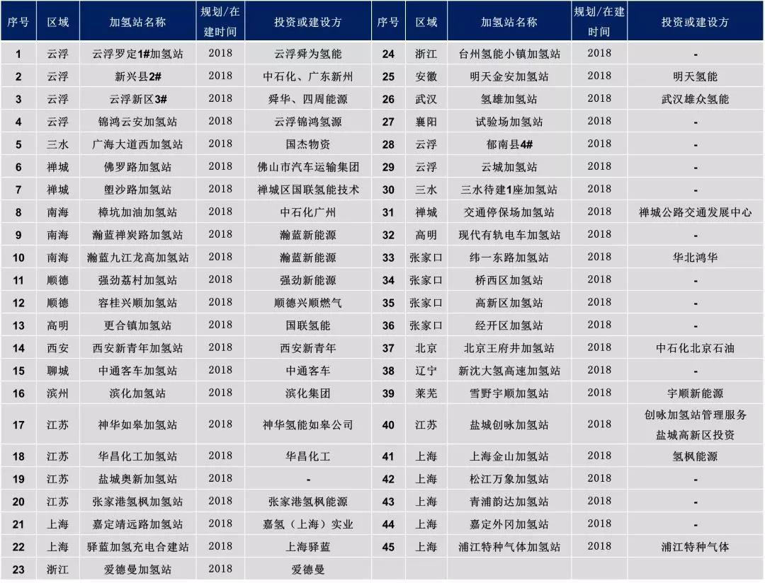 截止2018年8月,國(guó)內(nèi)在建和規(guī)劃建設(shè)的加氫站有45座: