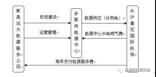 2012年新奧提出泛能網(wǎng)概念,做過的分布式能源項目有湖南長沙黃花機(jī)場項目(商業(yè)模式見圖3)、株洲神農(nóng)城項目、江蘇鹽城亭湖醫(yī)院項目等。泛能網(wǎng)的主要投資來源于設(shè)備投資,根據(jù)用能需求,規(guī)劃燃?xì)獍l(fā)電機(jī)組,溴化鋰余熱利用機(jī)組以實現(xiàn)多品味的余熱利用等。