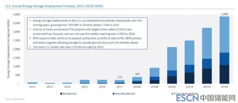 預(yù)計美國的儲能部署未來幾年將大幅加速,將從2018年393兆瓦增長到2019年的近1吉瓦。