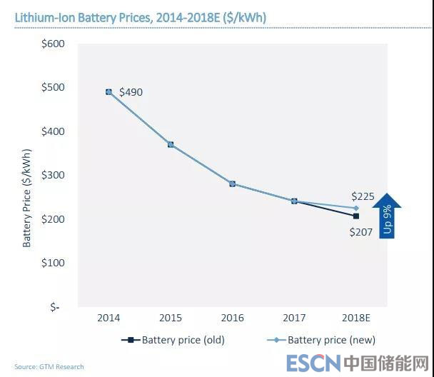 GTM Research預(yù)測2018年電池價格將再下跌14%,但價格下跌速度在上一季度顯著放緩。價格下跌速度的這種挫折并非僅僅是由于原材料價格上漲所致;相反,它來自市場上的電池短缺,特別是在用于電動汽車和固定儲能的鎳錳鈷氧化物電池(NMC)的情況下。對這些NMC電池的需求超過供應(yīng),因為目前沒有足夠的電池制造工廠可以滿足不斷增長的需求。然而,隨著未來兩年更大的生產(chǎn)能力上線,價格預(yù)計將進一步下降。