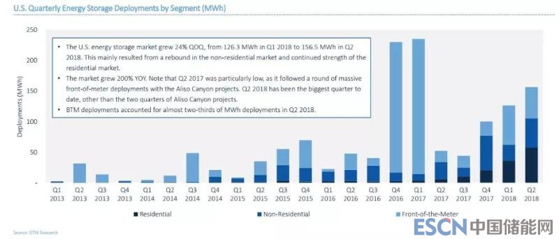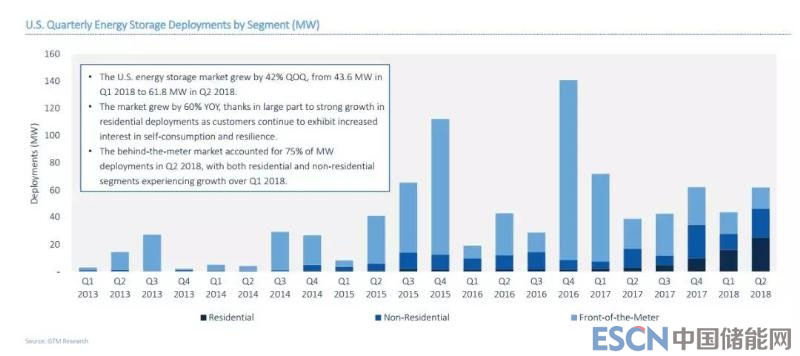 美國的儲能市場劃分為電表前和電表后,其中電表后又包括非戶用市場以及戶用市場。從2018年第二季度的數(shù)據(jù)來看,電表后儲能市場份額比重持續(xù)在提升。在2018年第二個季度,按功率計,電表后儲能部署占據(jù)2018年第二季度儲能市場的75%,按容量計,電表后儲能部署占據(jù)2018年第二季度儲能市場容量的近2/3。