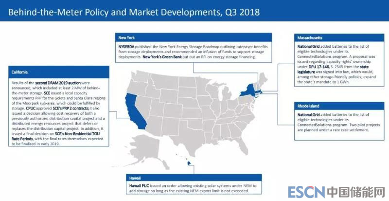 電表后儲能相關(guān)的州則相對少和集中一些,主要為東部的馬薩諸塞州、羅德島、紐約州,西部的加州以及夏威夷。其中涉及具體儲能容量的包括,加利福尼亞州公布了第二次DRAM 2019拍賣的結(jié)果,其中包括至少2兆瓦的電表后儲能空間。