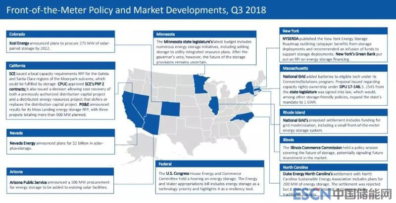 2018年第三季度,包括聯(lián)邦政府以及多個州均有儲能動態(tài)發(fā)布。其中電表前儲能已經(jīng)受到美國聯(lián)邦政府肯定。美國國會眾議院能源和商務(wù)委員會舉行了關(guān)于儲能的聽證會。在一項關(guān)于能源和水的撥款法案里,儲能被作為技術(shù)優(yōu)先事項,以及重要的靈活性工具加以強調(diào)。