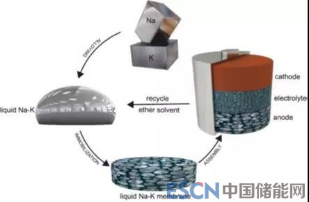 最近,為了更加安全經(jīng)濟(jì)地使用這種活潑液態(tài)金屬負(fù)極,Goodenough 老先生又開發(fā)了一種室溫Na/K合金負(fù)極膜---將合金液體滲透進(jìn)多孔金屬集流體薄膜[9]。這種創(chuàng)造性的設(shè)計(jì)減小了液態(tài)合金負(fù)極表面強(qiáng)勁的表面張力,提高了與液態(tài)電解質(zhì)之間的浸潤性,減小了電極/電解質(zhì)界面阻抗。此外,他們還探究了液態(tài)合金與不同電解液的相容性。碳酸酯電解液與合金負(fù)極不互溶,界面穩(wěn)定能夠抑制枝晶生長又不會(huì)造成電池內(nèi)短路;而醚類電解液會(huì)微量溶解合金負(fù)極,不適合全電池的裝配。