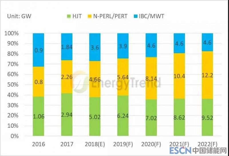 集邦新能源網(wǎng)EnergyTrend指出隨著IBC、HJT等電池新結(jié)構(gòu),N型單晶電池的效率優(yōu)勢(shì)會(huì)越來越明顯,市場(chǎng)占有率會(huì)逐步增加。并隨著雷射、離子注入等技術(shù)的量產(chǎn)化,HJT太陽能電池將可望在2022年達(dá)到接近10%市場(chǎng)占有率,IBC背部接觸式達(dá)4.6%。而傳統(tǒng)的P型電池市占率將逐年降低。