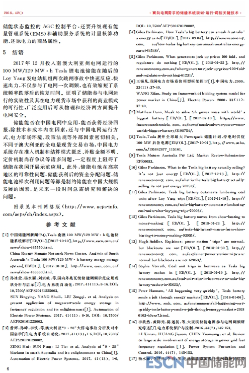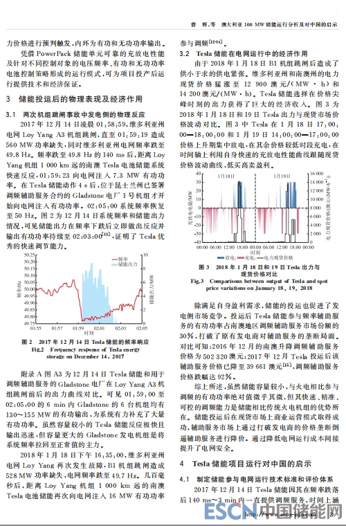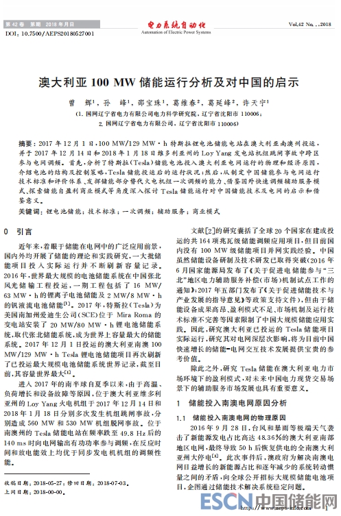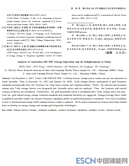 中國儲能網(wǎng)訊:2017年12月1日,100 MW/129 MW·h 特斯拉鋰電池儲能電站在澳大利亞南澳州投運(yùn),并于2017年12月14日和2018年1月18日維多利亞州的LoyYang發(fā)電站機(jī)組跳閘事故中跨區(qū)參與電網(wǎng)調(diào)頻。首先,分析了特斯拉(Tesla)儲能電池投入澳大利亞電網(wǎng)運(yùn)行的物理和經(jīng)濟(jì)原因,介紹電池的結(jié)構(gòu)及控制策略,Tesla儲能投運(yùn)后的運(yùn)行狀況;然后,從制定中國儲能參與電網(wǎng)運(yùn)行技術(shù)標(biāo)準(zhǔn)和評價(jià)體系、發(fā)揮儲能部分替代火電機(jī)組一次調(diào)頻的能力、借鑒國外快速調(diào)頻輔助服務(wù)模式、探索儲能自盈利商業(yè)模式等角度深入探討Tesla儲能運(yùn)行對中國儲能技術(shù)及電網(wǎng)的啟示和借鑒意義。