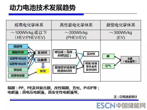 電池技術(shù)進(jìn)展,下圖是我們做“十二五”規(guī)劃時的圖,到現(xiàn)在為止沒有太大的變化,這是因為現(xiàn)有體系正極材料、負(fù)極材料有哪些都是確定的,只是不同正負(fù)極材料的搭配,能夠達(dá)到不同的性能指標(biāo)、能夠滿足不同車輛的使用。