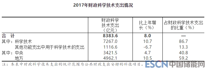 2017年,國家財政科學(xué)技術(shù)支出8383.6億元,比上年增加622.9億元,增長8%;財政科學(xué)技術(shù)支出占當年國家財政支出的比重為4.13%,與上年持平。其中,中央財政科學(xué)技術(shù)支出3421.5億元,增長4.7%,占財政科學(xué)技術(shù)支出的比重為40.8%;地方財政科學(xué)技術(shù)支出4962.1億元,增長10.5%,占比為59.2%。