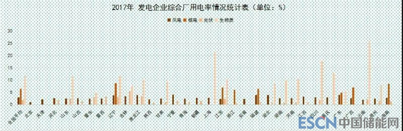 從全國看,2017 年燃氣發(fā)電、光伏發(fā)電平均綜合廠用電率分別為 2.23%、1.90%,同比分別上升 0.05 個百分點、0.18 個百分點,核電、生物質(zhì)發(fā)電平均綜合廠用電率分別為 6.58%、11.73%,同比分別下降 0.49 個百分點、0.07 個百分點。