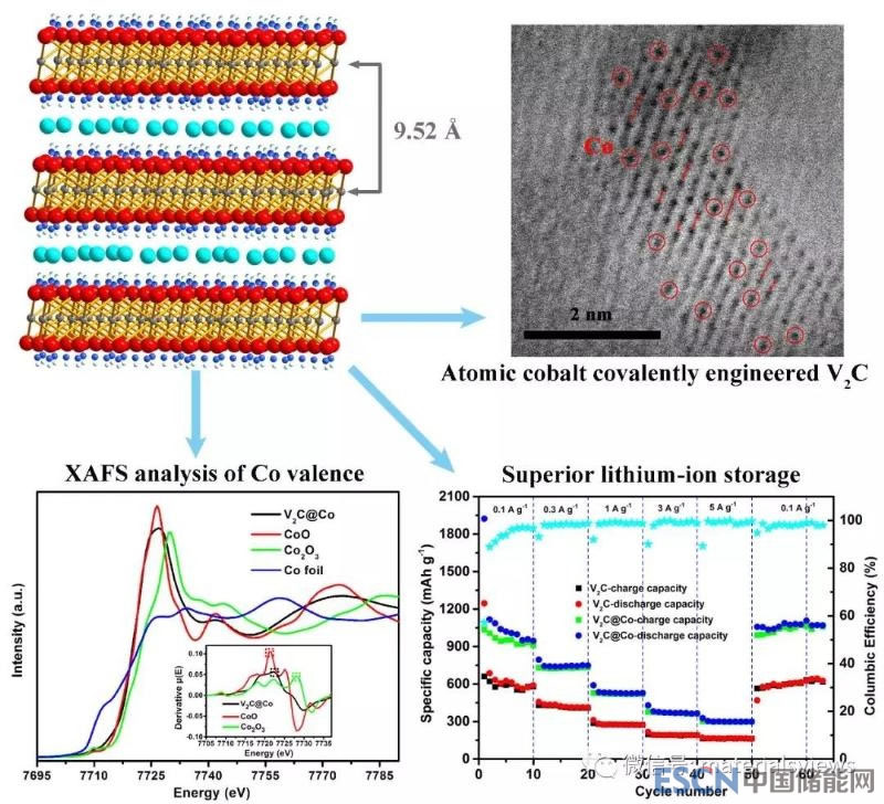 近期,中國科學(xué)技術(shù)大學(xué)國家同步輻射實驗室宋禮教授課題組通過鈷離子插層策略,成功設(shè)計和制備了具有超高儲鋰容量和優(yōu)異循環(huán)穩(wěn)定性的碳化礬 MXene電極材料。該研究通過液相刻蝕手段,在35℃下用HF刻蝕V2AlC MAX相得到了面間距為0.735 nm(小于以往報道面間距)的V2C MXene,在0.1 A/g的電流密度下表現(xiàn)出686.7 mA h/g 的儲鋰比容量,更加接近于V2C MXene約940 mA h g-1的理論儲鋰容量。在此基礎(chǔ)上,進一步通過鉀離子預(yù)插層和鈷離子交換方法,獲得了面間距擴大為0.952 nm的V2C MXene。同步輻射X-ray吸收譜分析證實了這種Co插層MXene層與層之間具有穩(wěn)定的V-O-Co鍵,其中二價鈷離子主要存在于V2C內(nèi)部層間,三價鈷離子主要存在于近表面的層間, 并最終計算了V2C中鈷離子的平均化合價為+2.12。由于插層鈷離子贗電容的貢獻以及V-O-Co鍵的形成,該插層材料表現(xiàn)出1117.3 mA h/g的儲鋰放電比容量,并且經(jīng)15000圈的循環(huán)充放電之后幾乎沒有容量衰減。進一步將V2C@Co電極作為正極與石墨烯負(fù)極組裝成鋰離子電容器并同樣展現(xiàn)出優(yōu)異的性能。這一研究工作基于同步輻射軟線和硬線的X-ray吸收譜技術(shù),不僅有效地解析了插層離子在MXene層間的存在形式,同時也為理解二維電極材料的能量存儲和轉(zhuǎn)化機制提供了一種有力的檢測手段。