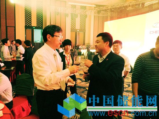 圖為奇瑞公司董事長(zhǎng)尹同躍(左)與天能集團(tuán)副總裁周建中(右)在年會(huì)上親切交談