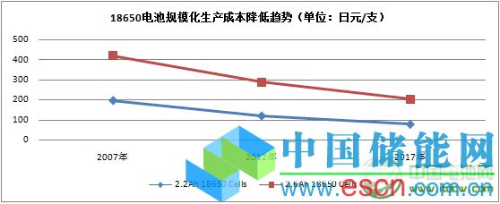 規(guī)?;a(chǎn)電池價(jià)格降低趨勢(shì)(以18650電池為例)