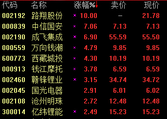 中國儲(chǔ)能網(wǎng)訊:鋰電池概念早盤飆升,截至發(fā)稿,路翔股份漲停,中信國安漲逾7%,成飛集成漲逾6%,萬向錢潮、西藏城投漲逾4%,錢江摩托、贛鋒鋰業(yè)漲逾3%,板塊個(gè)股漲多跌少。