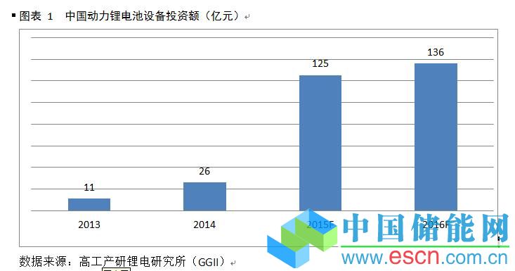 基于對新能源汽車市場未來的樂觀預期,2014年下半年開始,中國汽車動力鋰電池迎來投資熱潮。2015年上半年動力鋰電池設備訂單額超過80億元,預計全年投資將超過百億元,主要是以比亞迪、CATL、國軒等市場份額領先的企業(yè)擴產(chǎn)為主。
