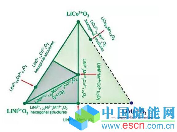 三元材料(NMC)實(shí)際上是綜合了LiCoO2、LiNiO2和LiMnO2三種材料的優(yōu)點(diǎn),由于Ni 、Co和Mn之間存在明顯的協(xié)同效應(yīng),因此NMC的性能好于單一組分層狀正極材料,而被認(rèn)為是最有應(yīng)用前景的新型正極材料之一。
