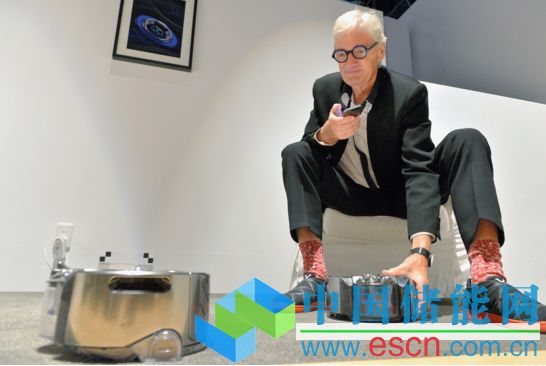 戴森公司創(chuàng)始人兼董事長詹姆斯·戴森在東京展示機器人吸塵器“戴森360 Eye”